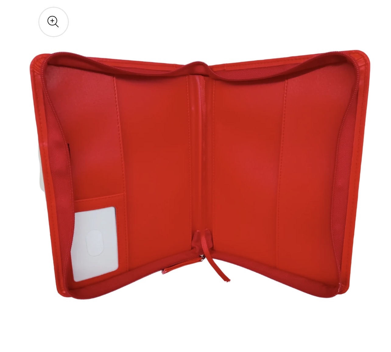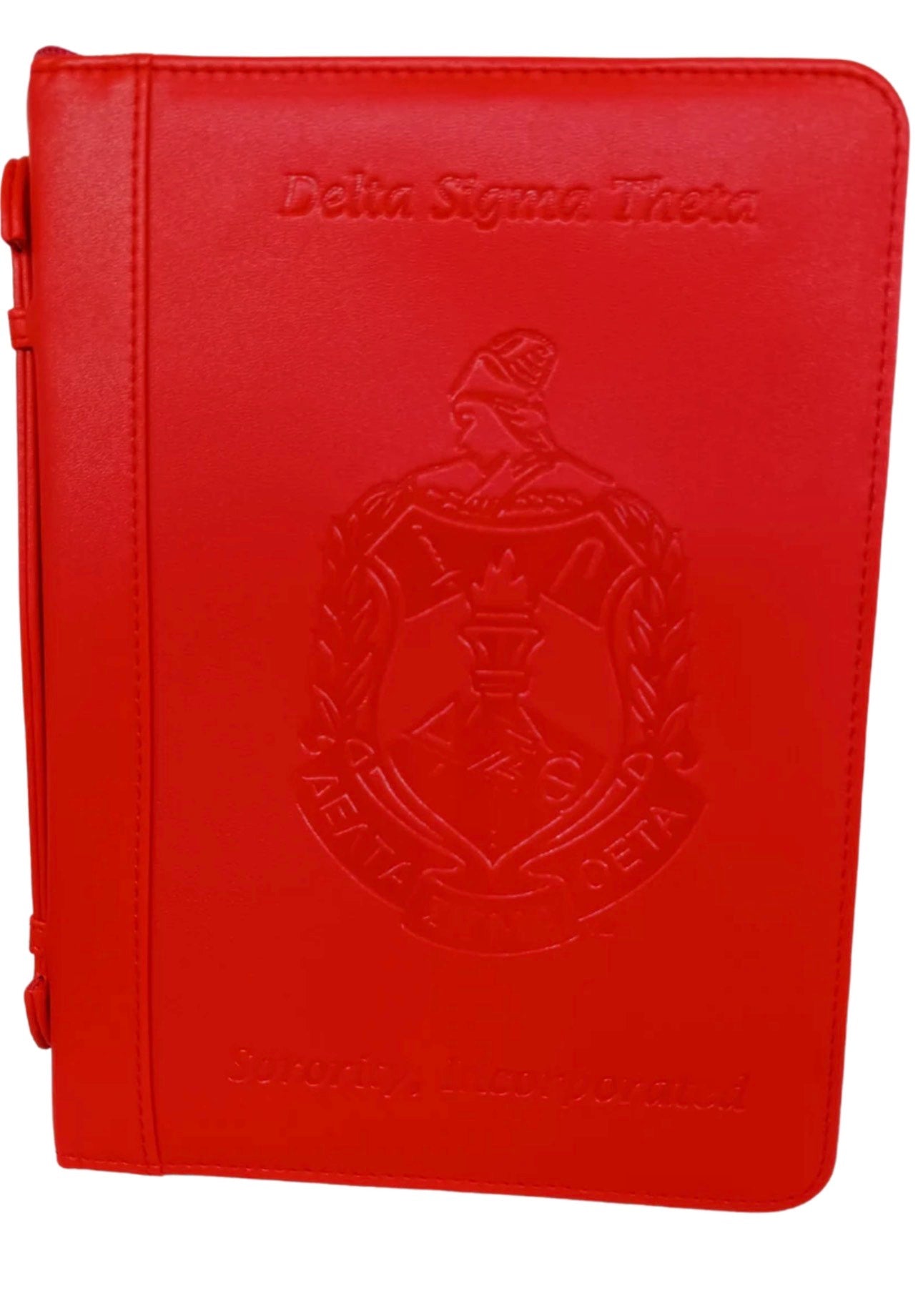 Our premium vegan leather cover is embossed with a beautiful embossing of the Sorority crest and name. The ritual cover has an attached embossed carrying handle reads "Since 1913"; a red satin bookmark inside attached to the cover; a pen holder and ID slot; closes with a zipper. (Penlight IS included.)
